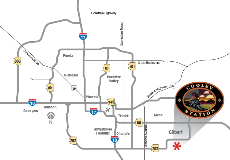 Cooley Station includes Verde @ Cooley Station, a new vibrant urban village, a Frys Marketplace, a wide choice of housing styles, abundant parks and open spaces, walking and biking trails, friendly neighborhoods, and tree lined streets. Cooley Station is conveniently located close to major freeway arteries, state-of-the-art healthcare facilities, a world class university campus, Phoenix/Mesa Gateway Airport, and much more.